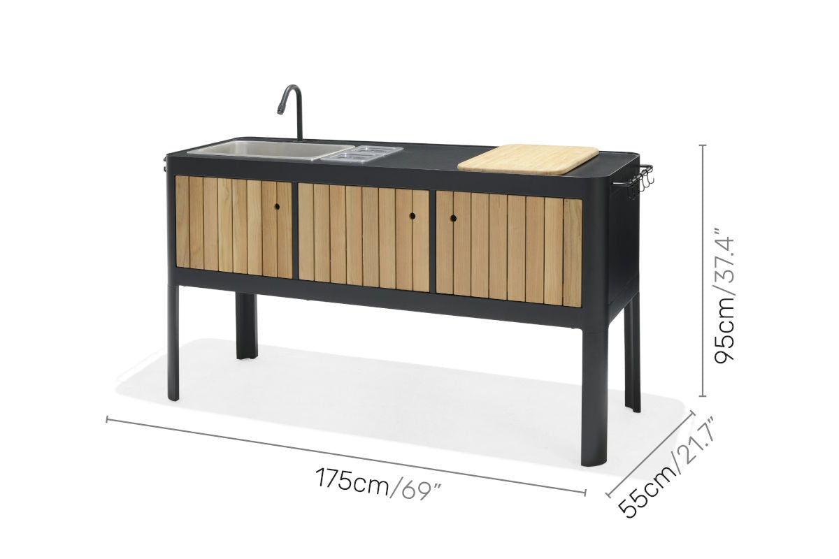 A portable outdoor kitchen made from aluminium and FSC- certified teak components in combination with functionality and elegance. Additionally, it includes a stainless steel sink and FSC cutting board and cover, ready to make your cooking enjoyable and fast. This portable kitchen is a dream come true, giving you full benefit of spending time outside with your family or friends.