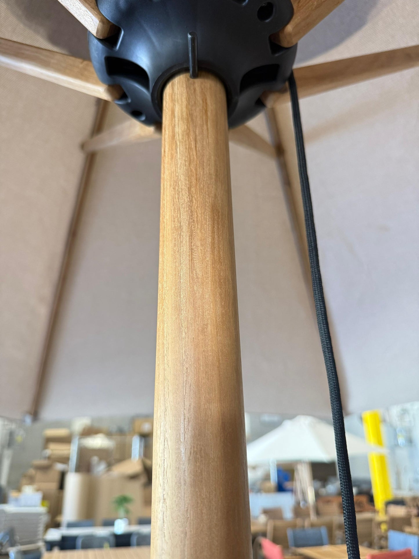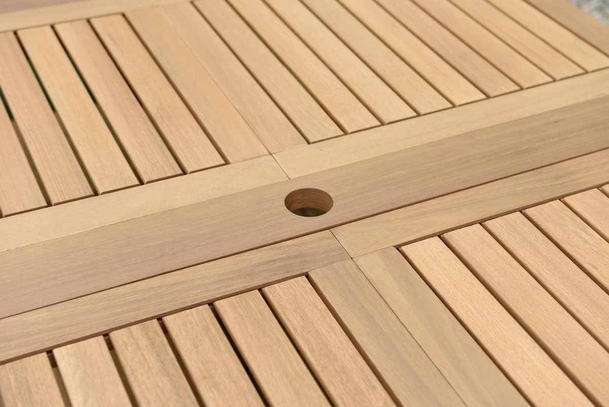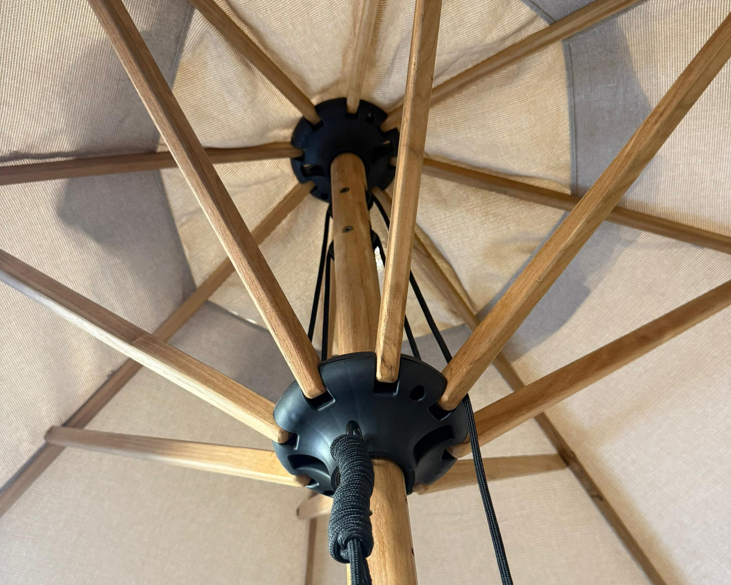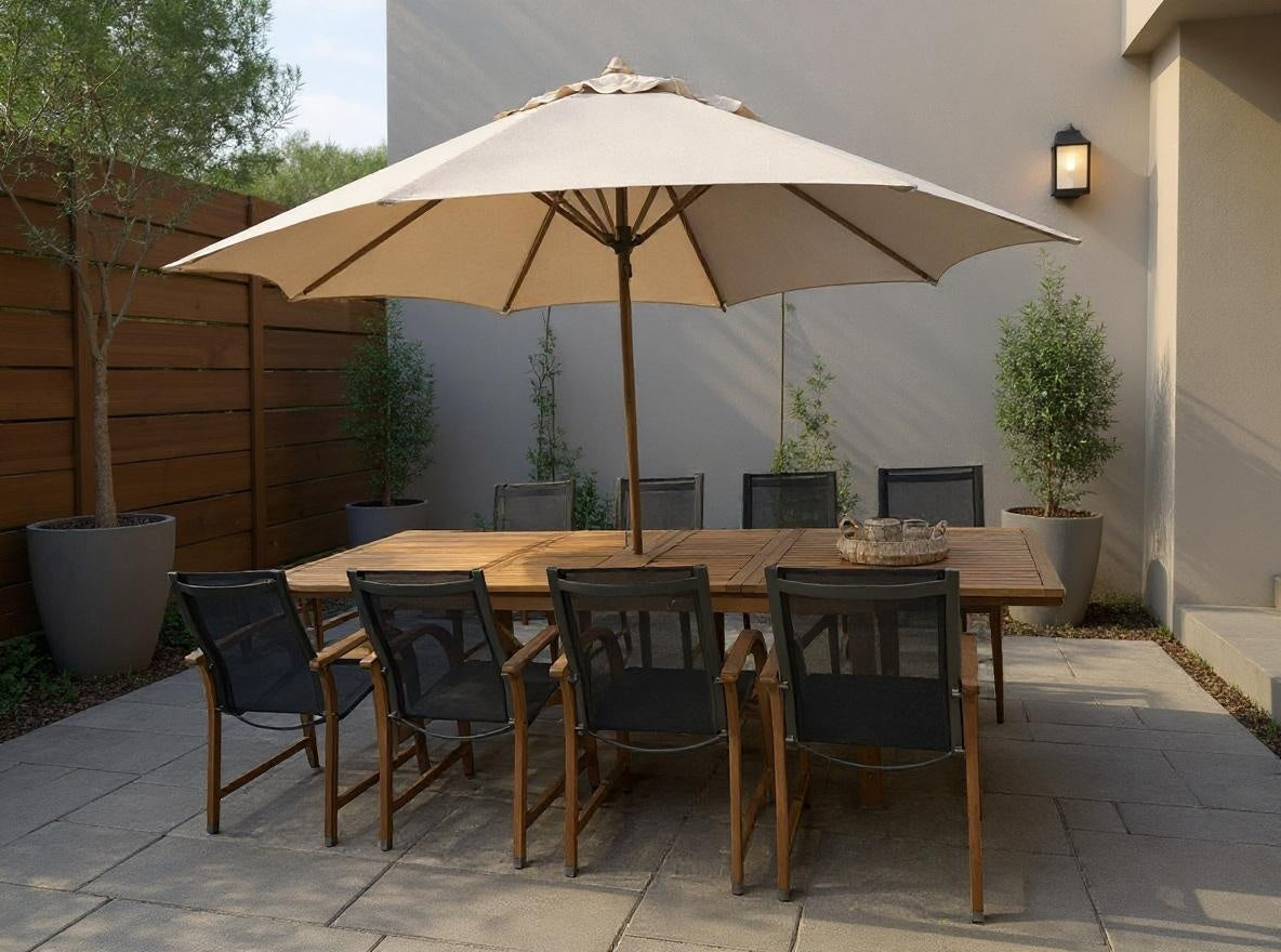 Optional Teak Umbrella: a premium 11.5 ft round teak patio umbrella (parasol) with a solid teak wood frame and fade-resistant Olefin canopy for superior UV protection, shade, and style. Large canopy provides full coverage for the entire table area, making it ideal for sunny patios, decks, and poolside dining.