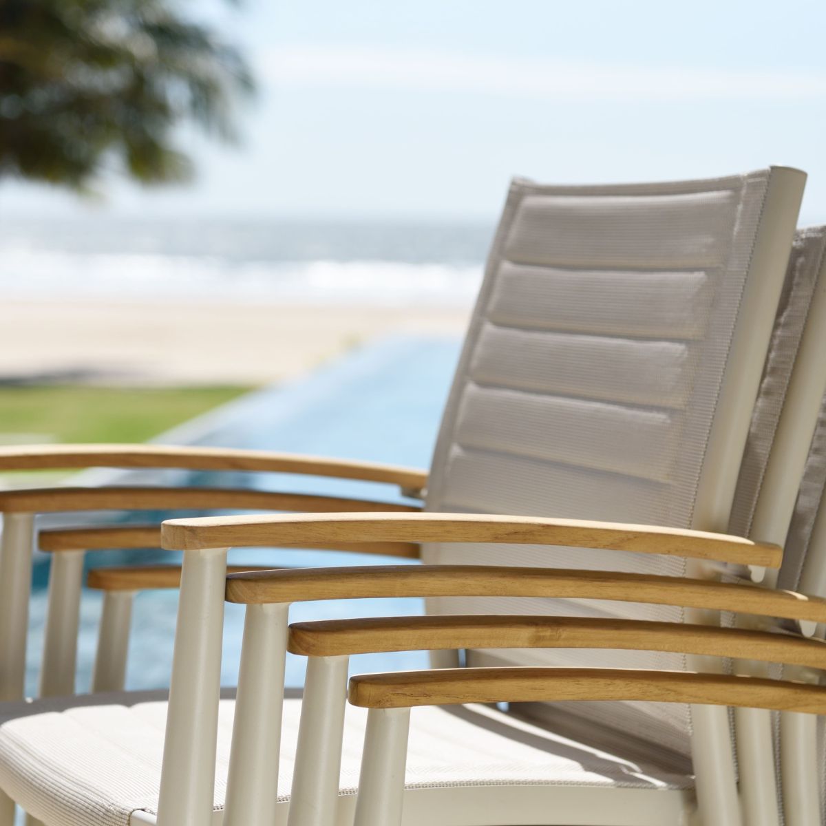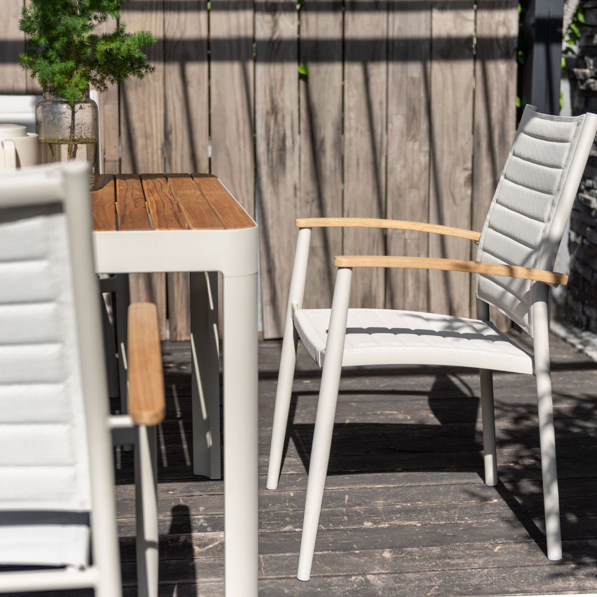 The Portals range is characterized by unique urban design and first-class comfort – and so does its lite stacking armchair. Made in elegant aluminum in combination with Weather-net® for additional comfort and FSC-certified Teak finish, this chair is not only extremely durable but also visually striking. Revitalize your outdoor or semi-outdoor space with a touch of gourmet vibe and finesse while enjoying summer drinks.