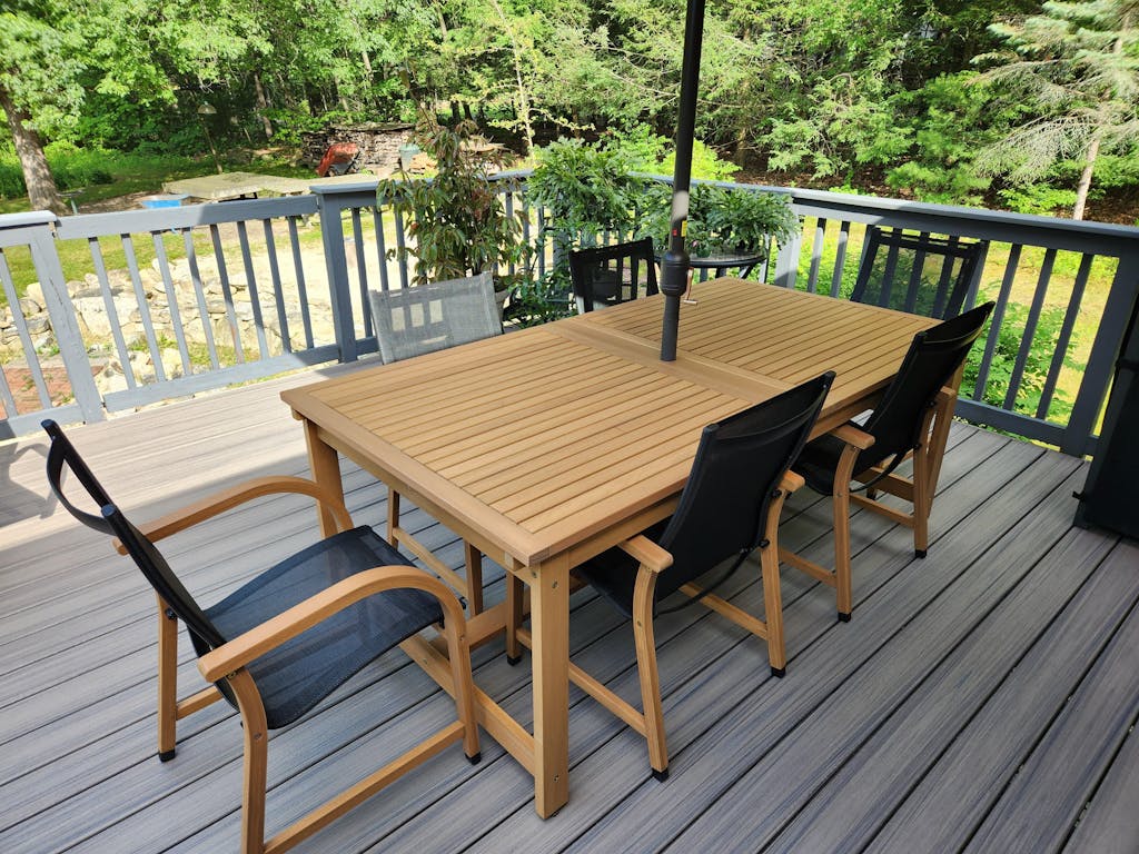 Optional Teak Umbrella: a premium 11.5 ft round teak patio umbrella (parasol) with a solid teak wood frame and fade-resistant Olefin canopy for superior UV protection, shade, and style. Large canopy provides full coverage for the entire table area, making it ideal for sunny patios, decks, and poolside dining.